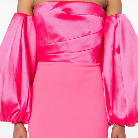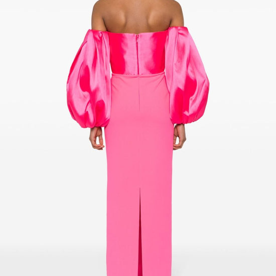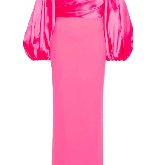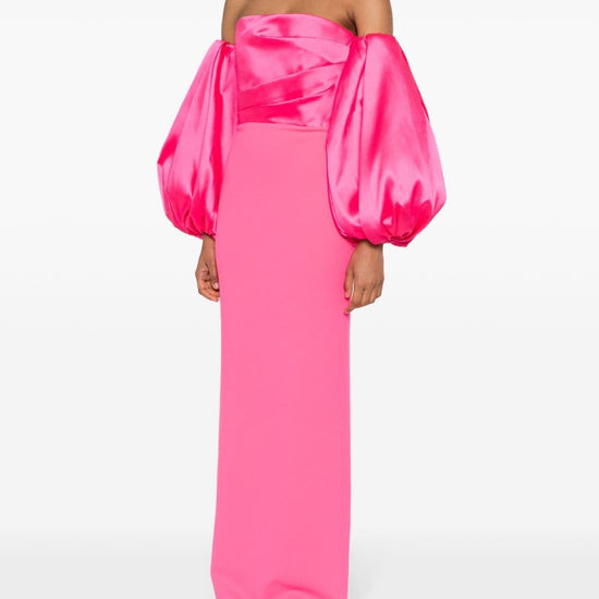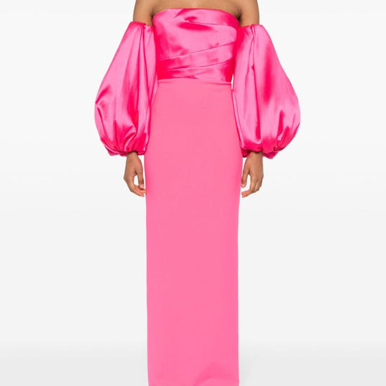 Ultra pink panelled design satin finish panel stretch-crepe texture panel column silhouette off-shoulder long puff sleeves elasticated cuffs pleat detailing to the chest boned bodice fitted waistline floor-length straight hem rear slit full lining concealed rear hook and zip fastening offshoulder, manica palloncino carmen maxi dress size and fit - this piece fits true to size. we recommend you get your regular size. model is 1,75m / 5ft 8in wearing size 8 (uk)