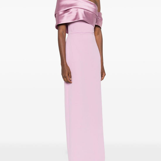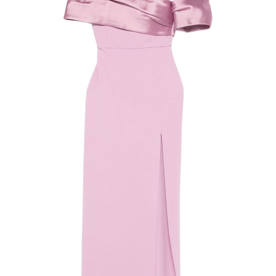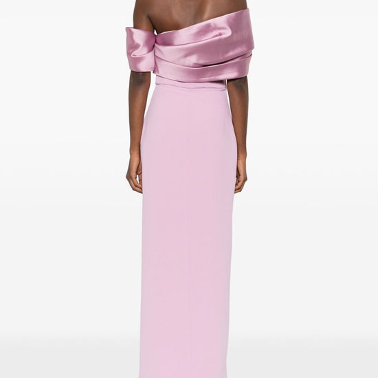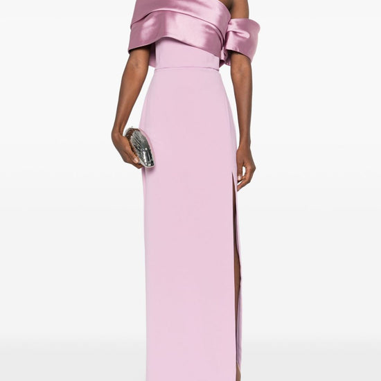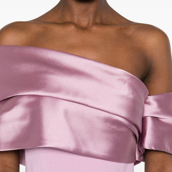 Pink off-shoulder design side slit woven texture maxi length draped detail alexis masi dress