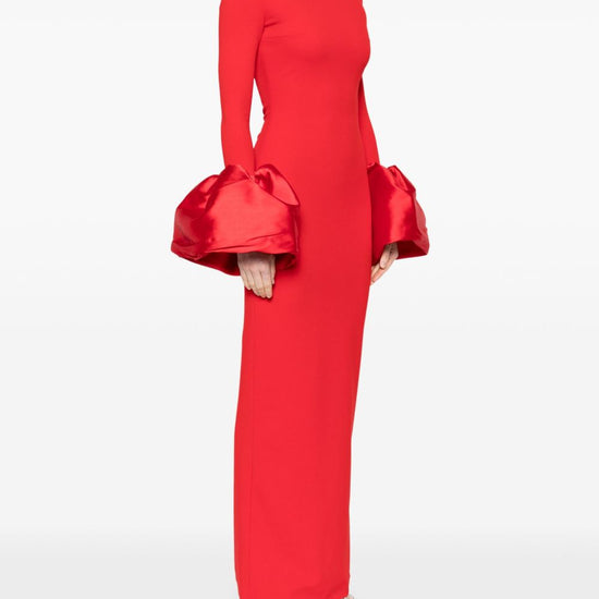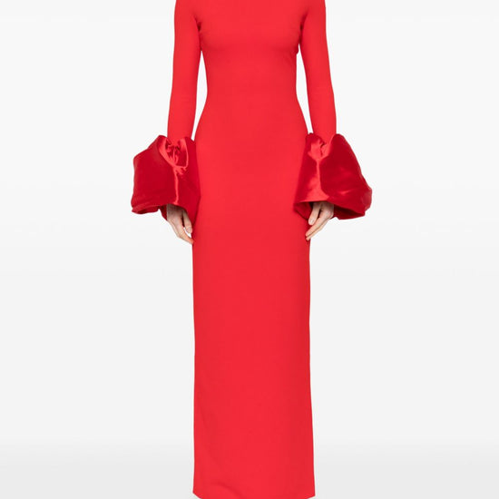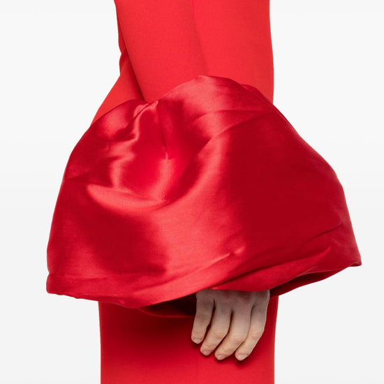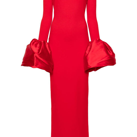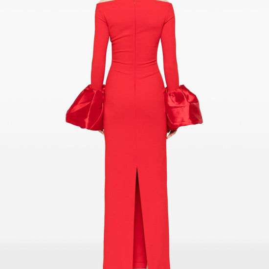 Red crepe texture column silhouette off-shoulder concealed rear hook and zip fastening long sleeves oversized puff cuffs rear slit straight hem maxi talia maxi dress size and fit - this piece fits true to size. we recommend you get your regular size. model is 1,75m / 5ft 8in wearing size 8 (uk)