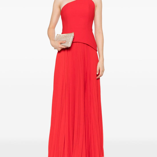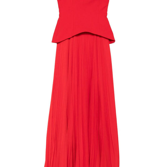 Red strapless bodice pleated skirt fitted top asymmetric neckline straight hemline britt maxi dress size and fit - this piece fits true to size. we recommend you get your regular size. model is 1,75m / 5ft 8in wearing size 8 (uk)
