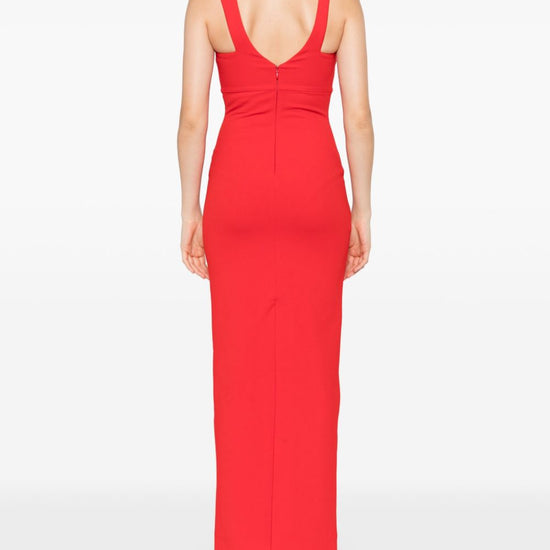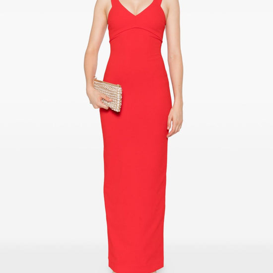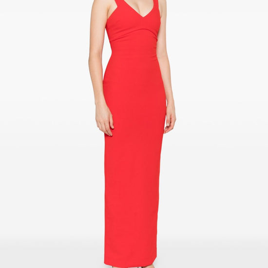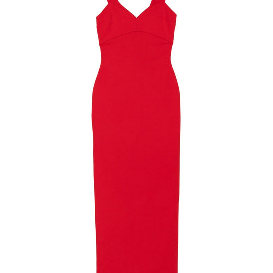 Red sleeveless design v-neckline fitted bodice maxi length straight skirt nalani maxi dress size and fit - this piece fits true to size. we recommend you get your regular size. model is 1,75m / 5ft 8in wearing size 8 (uk)