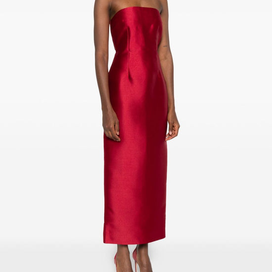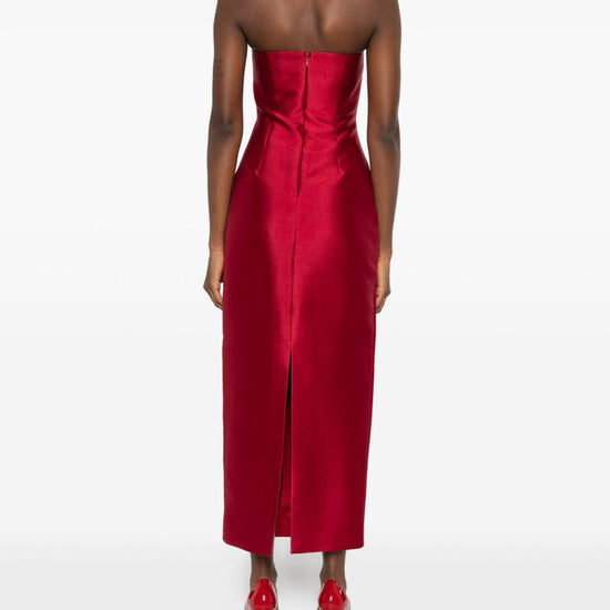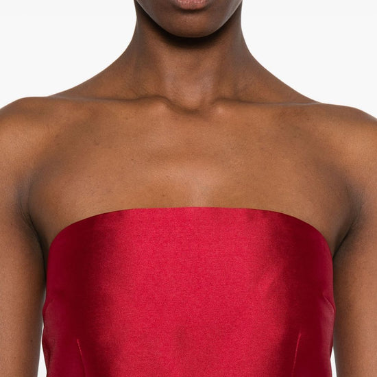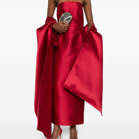 Bright red strapless draped design pleated detail renee maxi dress