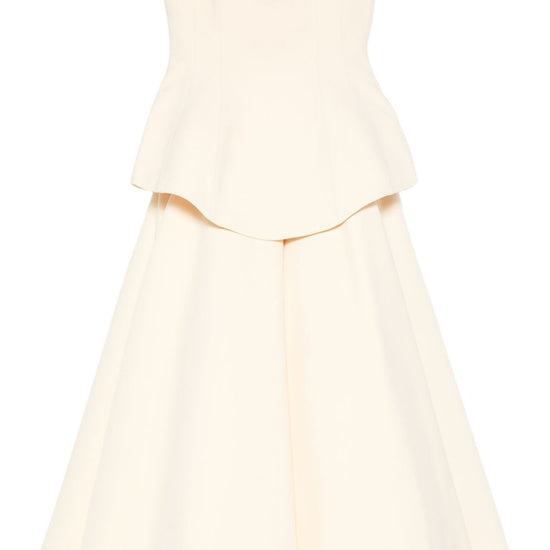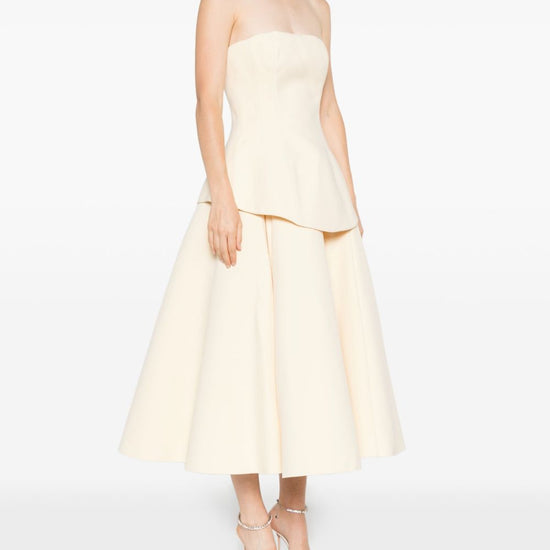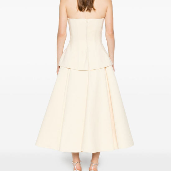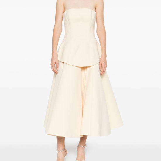 Beige strapless peplum detail a-line skirt concealed zip fastening panelled construction ada maxi dress