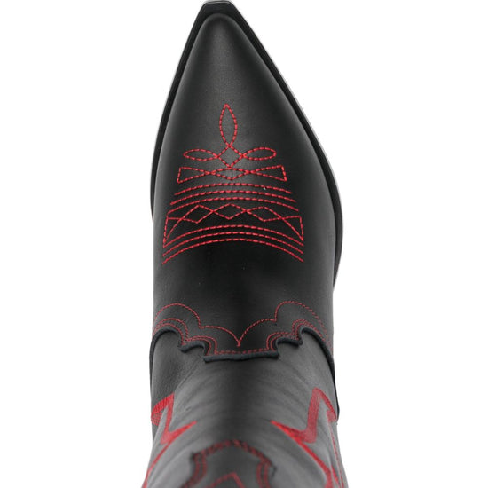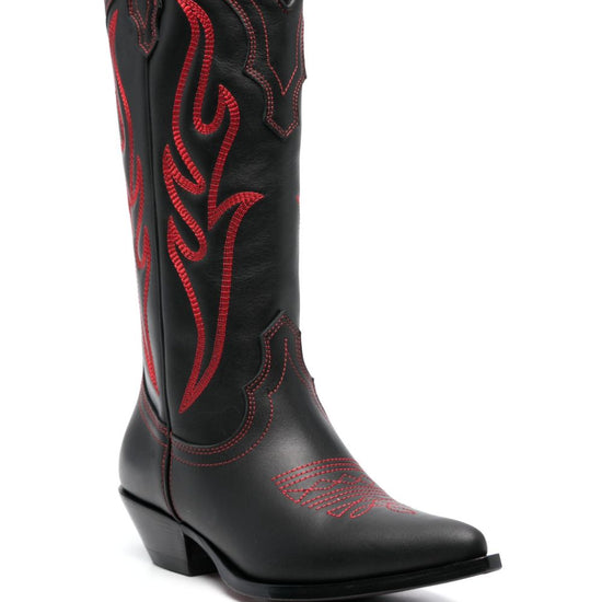 Santa fe 35mm calf-length boots from sonora featuring jet black, calf leather, contrast stitching, embroidered design, double pull-tab at the opening, pointed toe, low block heel, pull-on style and calf-length. texano embroidered suede western boots size and fit - heel 1,4 in / 3,5 cm