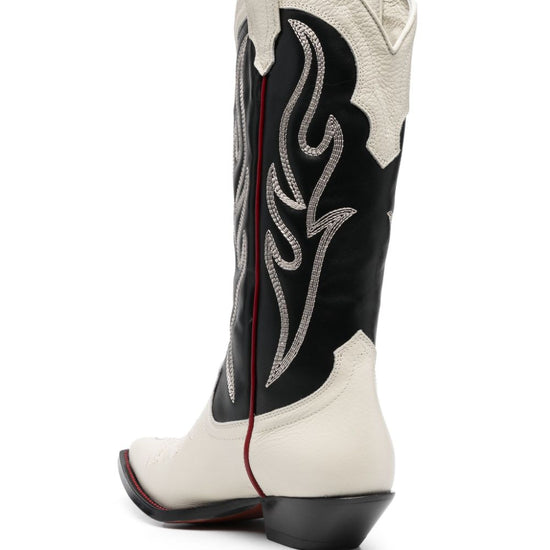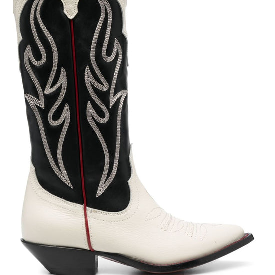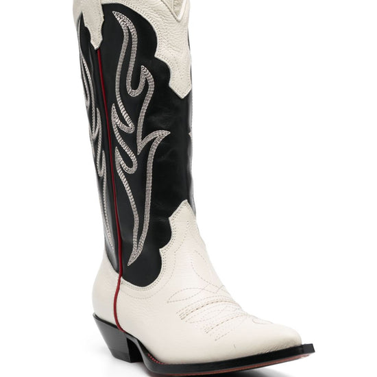 Santa fe 50mm boots from sonora featuring black/white, calf leather, decorative stitching, pull-on style, branded leather insole, mid block heel and pointed toe. texano embroidered suede western boots size and fit - heel 3,9 in / 10 cm; platform 0,4 in / 1 cm