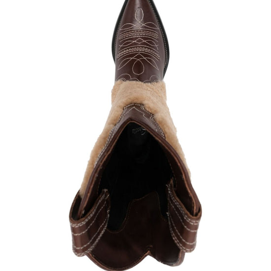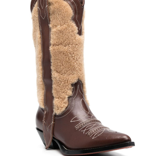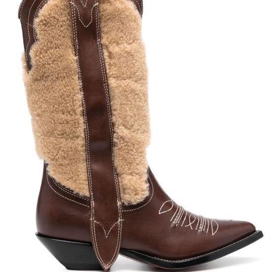 San luis 50mm boots from sonora featuring brown, decorative stitching, appliqué detail, pull-on style, branded leather insole, mid block heel and pointed toe. logo + montone embroidered leather texan boots size and fit - heel 2 in / 5 cm; platform 0,4 in / 1 cm