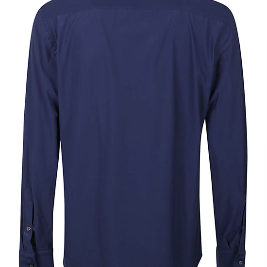 Blue shirt, buttons closure, high collar. long-sleeves shirt size and fit - this piece fits true to size. we recommend you get your regular size. model is 1,84m / 6ft 1in wearing size 39 (collar cm)