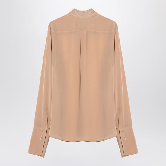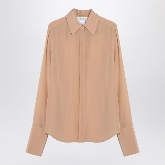 Beige silk shirt from sportmax featuring long sleeves with buttoned cuffs, pointed collar, concealed front placket and curved hem. size and fit - model wears size 40 frmodel measurements:height: 176cmchest: 86 cmwaist: 64 cmhips: 89 cm