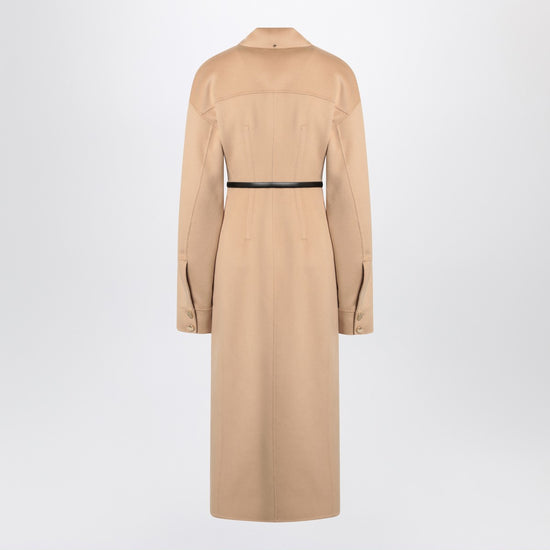 Sportmax coat in camel virgin wool, characterized by darts and shaped sides, leather belt with s buckle, overlapping side slits, shirt collar, hidden buttoning with the first metallic button visible, long sleeves with buttoned cuffs and regular fit. size and fit - model wears size 40 it model measurements: height: 178 cm chest: 83 cm waist: 63 cm hips: 91 cm
