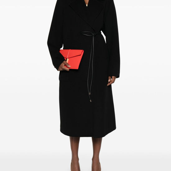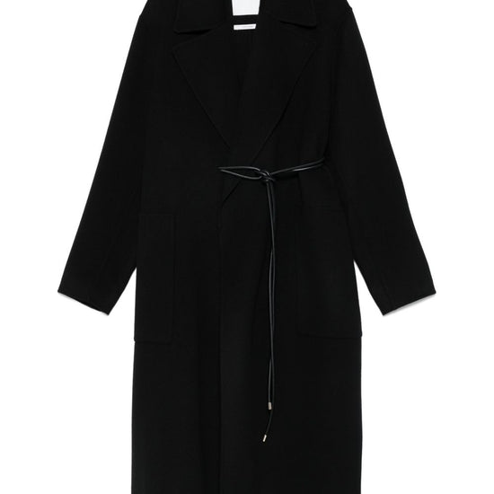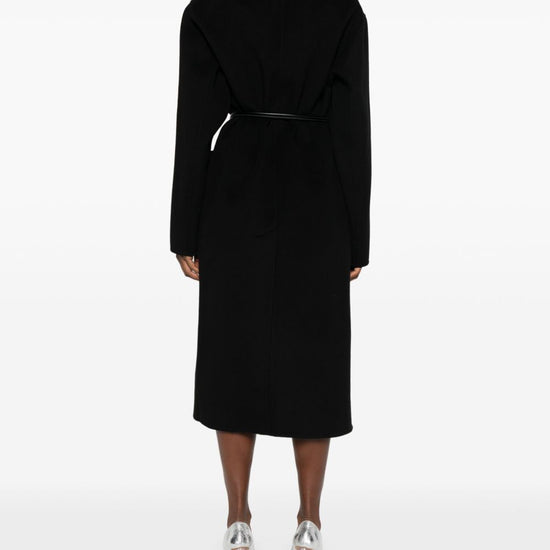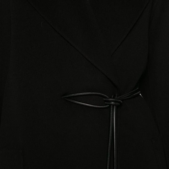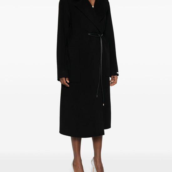 Black belted waist wide notch lapels long sleeves long wool coat