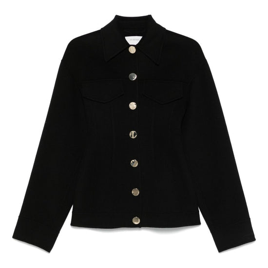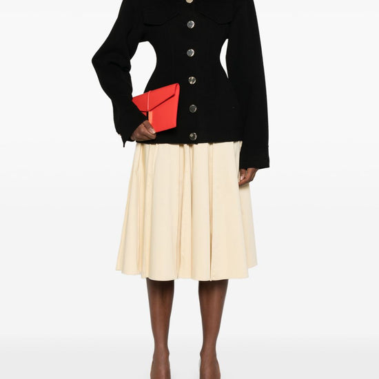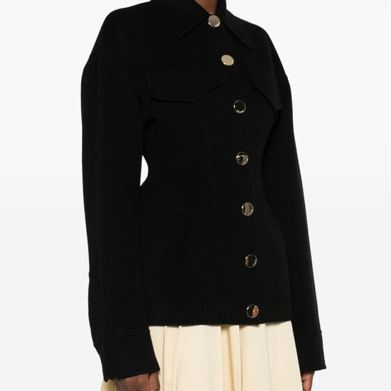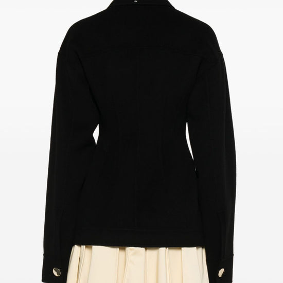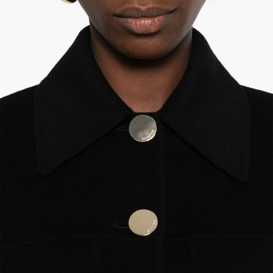 Black virgin wool notched collar long sleeves two side welt pockets central rear vent partial lining double-breasted button fastening wool coat