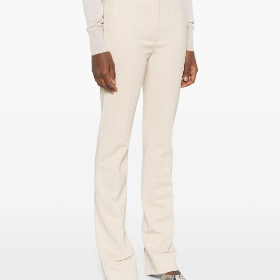 Beige concealed front fastening belt loops two side inset pockets two rear jetted pockets short side slits slim trousers