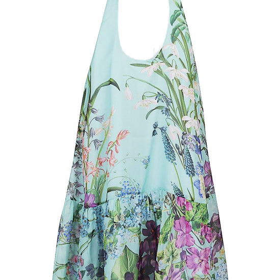 Light blue dress, high collar with button closure on the back, floral pattern, neckline on the back. bonnie printed silk dress size and fit - this piece fits true to size. we recommend you get your regular size. model is 1,75m / 5ft 8in wearing size s