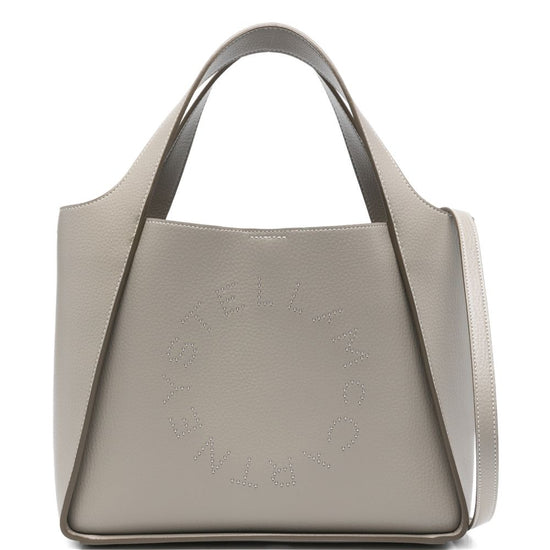 Grey grained texture logo detail top handle detachable shoulder strap internal slip pocket this piece comes complete with a protective dust bag. stella logo tote bag size and fit - depth: 13.0 centimetres. height: 22.0 centimetres. width: 31.5 centimetres. strap: 52.0 centimetres. handle: 15.0 centimetres.
