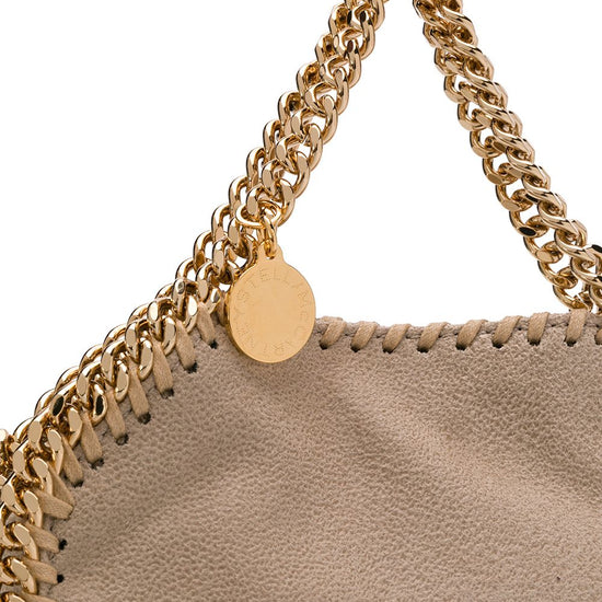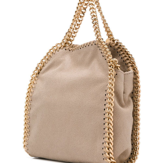Honey, i shrank the falabella! stella mccartney has scaled down the iconic bag to present a miniature version that you can't help but adore. created in a clotted cream hue, this faux leather tiny falabella tote is embellished with the signature diamond-cut chain trim and whip-stitch detailing we all know and love. the best things come in tiny packages. featuring a chain shoulder strap, a magnetic closure, two chain top handles, gold-tone hardware and a logo charm. falabella tiny crossbody bag size and fit - depth: 6.0 centimetres. handle: 7.0 centimetres. height: 17.5 centimetres. strap: 47.0 centimetres. width: 17.5 centimetres.