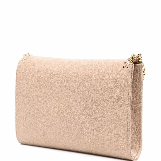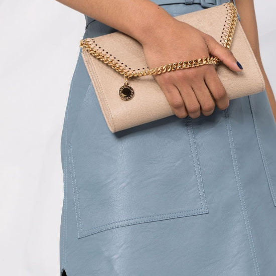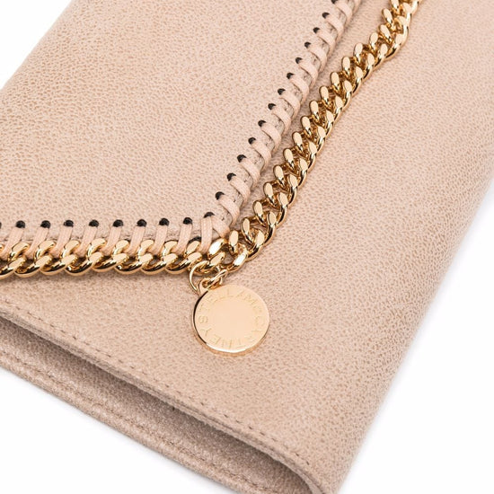 Beige vegan leather whipstitch trim chain-link trim logo charm gold-tone hardware foldover top with magnetic fastening internal slip pocket logo-print lining falabella wallet on chain size and fit - depth: 2.0 centimetres. height: 13.0 centimetres. strap: 52.0 centimetres. width: 22.0 centimetres.