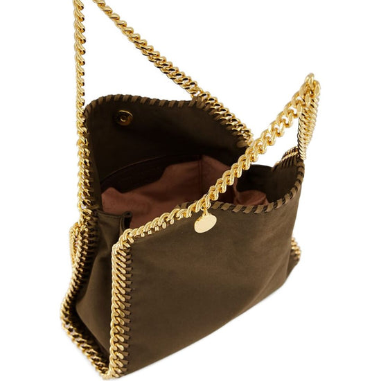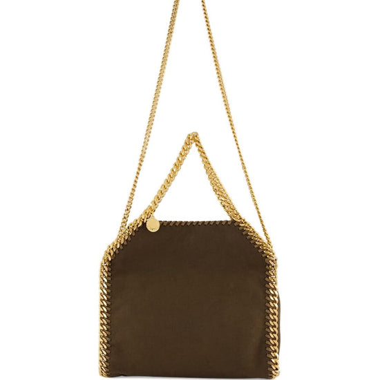 Brown chain strap top handle internal slip pocket round charm falabella mini tote