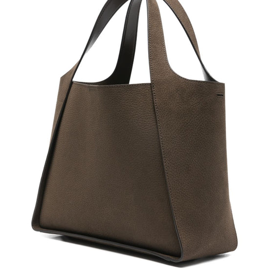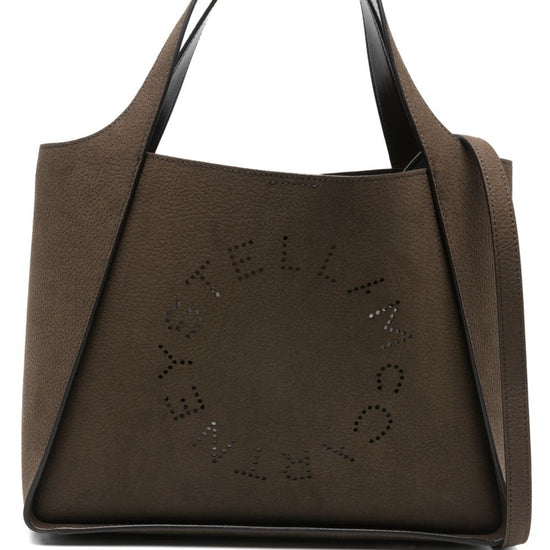Brown top handle shoulder strap perforated logo internal slip pocket this piece comes complete with a protective dust bag. stella logo tote bag size and fit - depth: 13.0 centimetres. height: 22.0 centimetres. width: 31.5 centimetres. handle: 13.0 centimetres. strap: 52.0 centimetres.