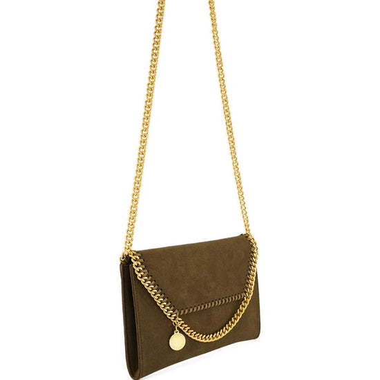 Brown chain strap charm detail magnetic flap closure falabella wallet on chain