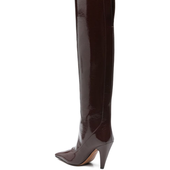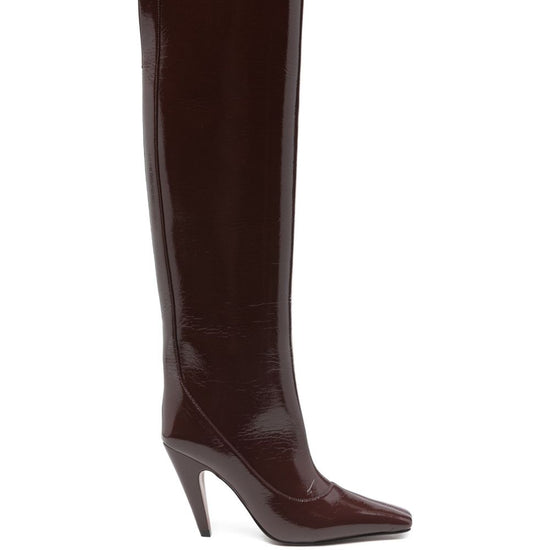 Brown patent leather square toe high heel spur boots size and fit - heel: 10.0 centimetres.