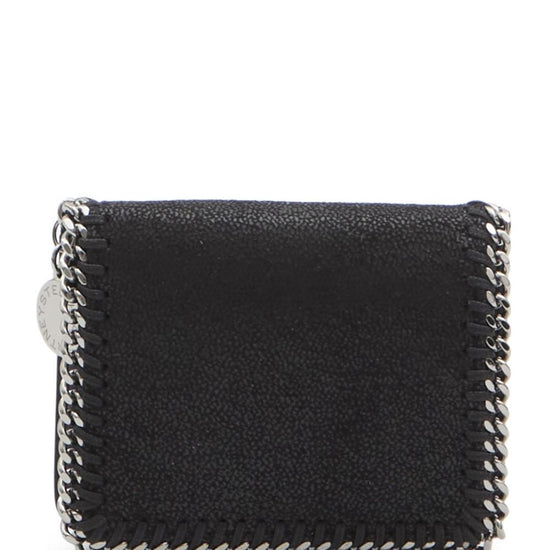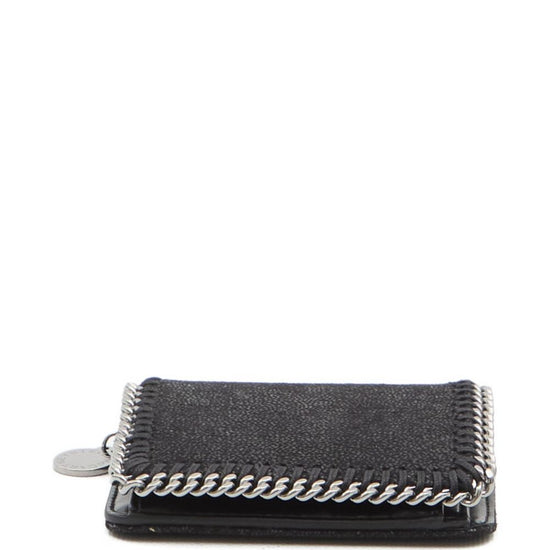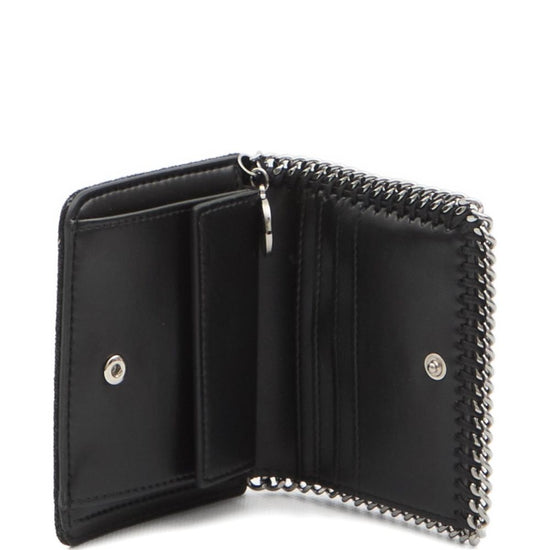 Black snap-button closure coin pocket four card slots bill compartment logo charm falabella bifold wallet