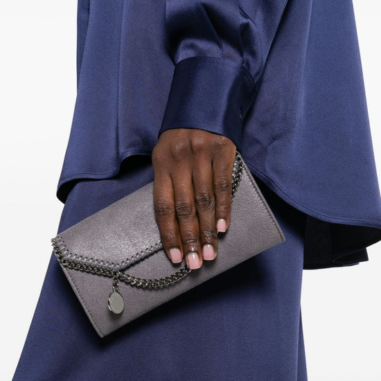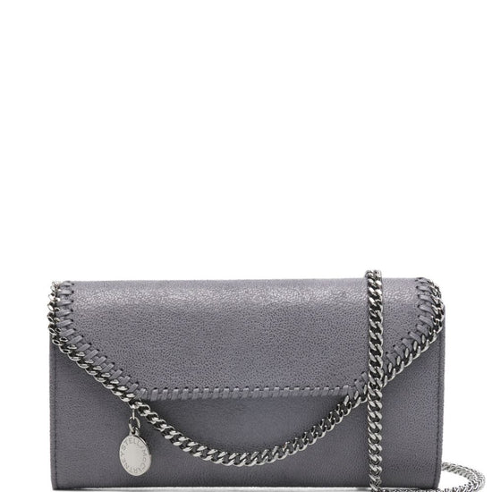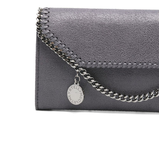 Dark grey chain trim chain shoulder strap round charm internal zipped pocket press-stud fastening falabella continental wallet size and fit - depth 4 cm. width 11 cm. length 19 cm.