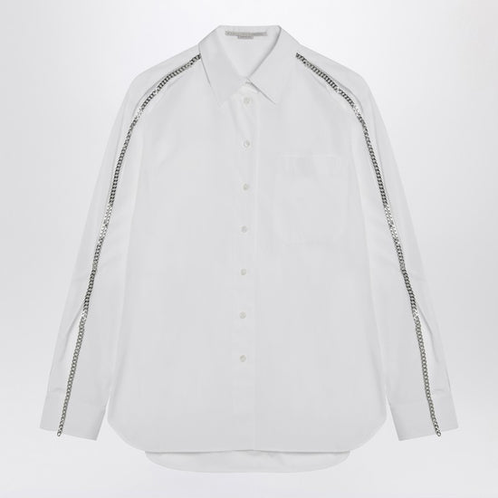 White cotton oxford shirt by stella mccartney, featuring a front button closure, a patch pocket on the chest, pointed collar, long sleeves with falabella chain, buttoned cuff, cut out details, and curved hem. size and fit - model wears size 40 it model measurements: height: 179 cm chest: 82 cm waist: 65 cm hips: 90 cm