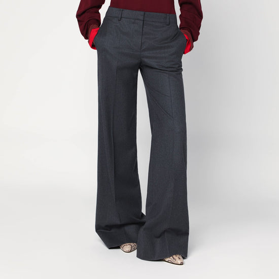 Wide pants by stella mccartney in grey wool, featuring a front zip closure with hook, belt loops, two side welt pockets, a crease at the front, and a back welt pocket with button. size and fit - model wears size 40 it model measurements: height: 178 cm chest: 83 cm waist: 63 cm hips: 91 cm