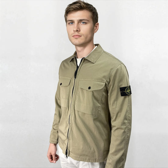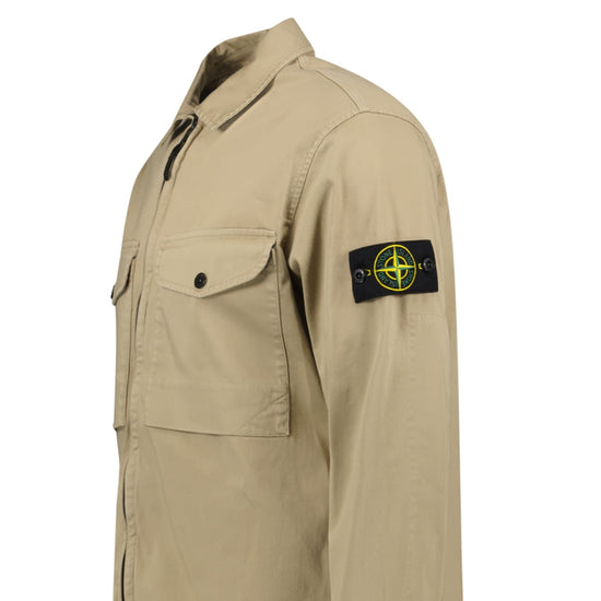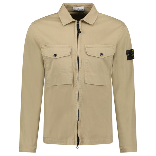 elevate your wardrobe with the stone island organic stretch cotton satin overshirt in beige. crafted from garment-dyed organic stretch cotton satin, this overshirt offers a blend of durability and comfort. the classic collar and two-way zip closure provide a timeless look, while the chest flap pockets with snap buttons add functional detail. adjustable snap button cuffs ensure a personalized fit, and the iconic stone island badge on the left sleeve signifies quality and style.