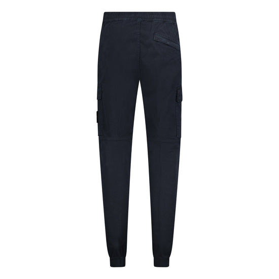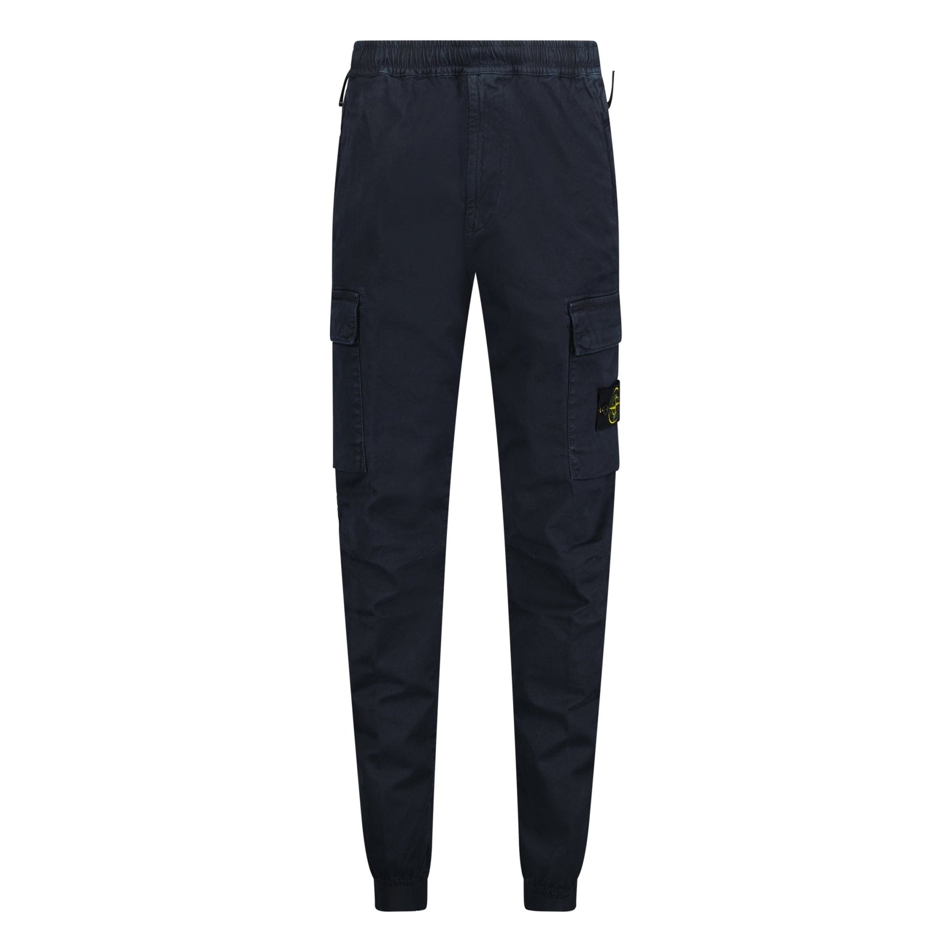 the stone island 'pantalone' cuffed cargo trousers in navy will modernise your off-duty wardrobe basics. this pair is designed for a straight-leg fit and has a mid-rise waist with a zippered fly and cuffed for comfort, making it a stylish weekend pair. this pair is finished with the instantly recognisable stone island compass badge buttoned to the leg and is constructed from a stretch blend of cotton with various cargo-style pockets.