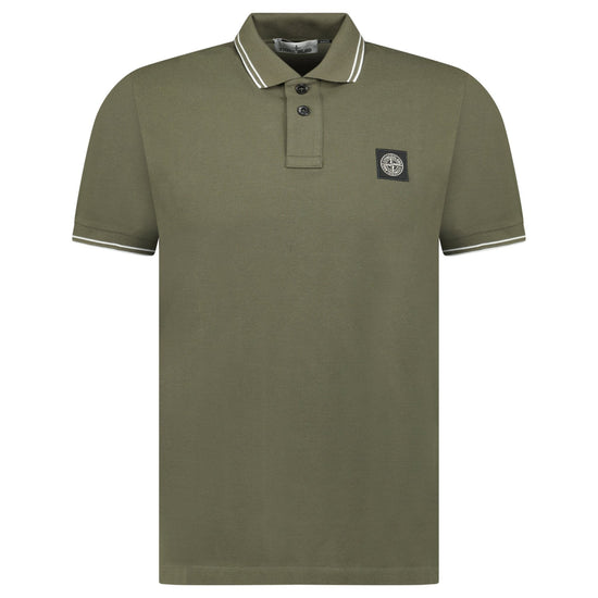 enhance your casual wardrobe with the slim fit stone island patch logo stripe collar polo t-shirt in military green. crafted from premium cotton, this polo boasts a classic silhouette with a modern twist. featuring the iconic stone island logo patch and striped collar detail, it's a versatile choice for effortless style and comfort