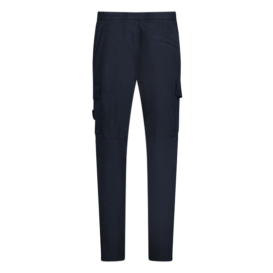 the stone island 'pantalone' cargo trousers in navy will modernise your off-duty wardrobe basics. this pair is designed for a straight-leg fit and has a mid-rise waist with a zippered fly and belt loops for comfort, making it a stylish weekend pair. this pair is finished with the instantly recognisable stone island compass badge buttoned to the leg and is constructed from a stretch blend of cotton with various cargo-style pockets.
