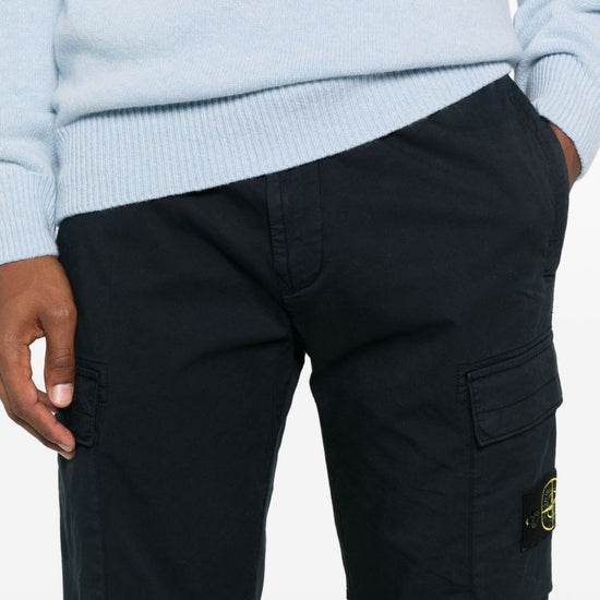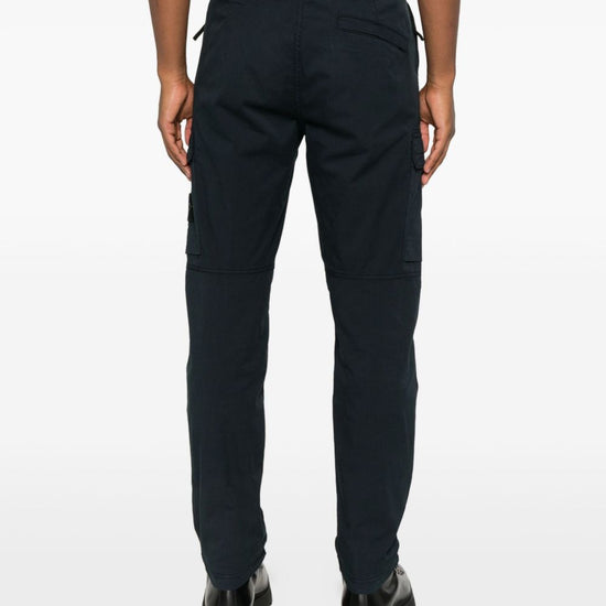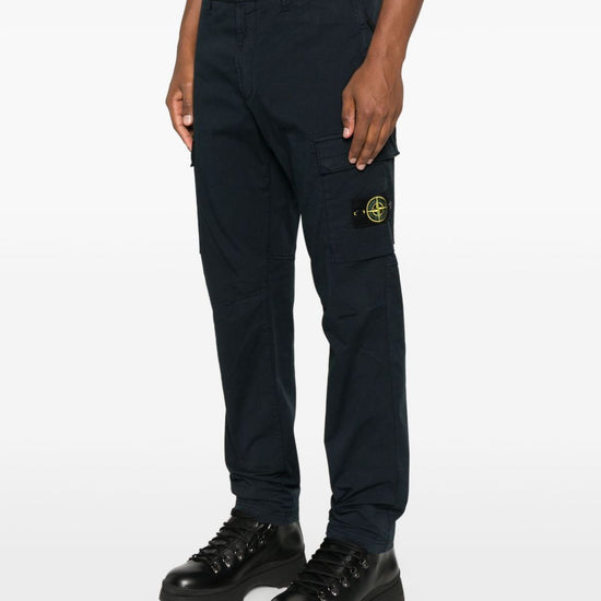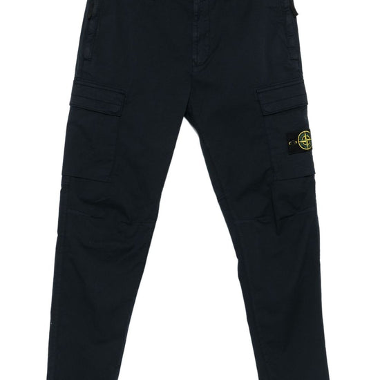 Navy blue cargo pockets zip and button fly logo patch cotton cargo trousers
