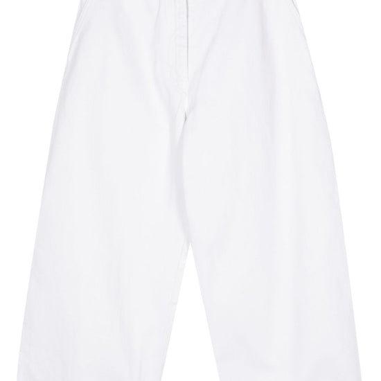 White cotton blend denim logo patch to the rear belt loops two diagonal pockets to the sides two rear patch pockets wide leg front button and zip fastening chalco cropped jeans