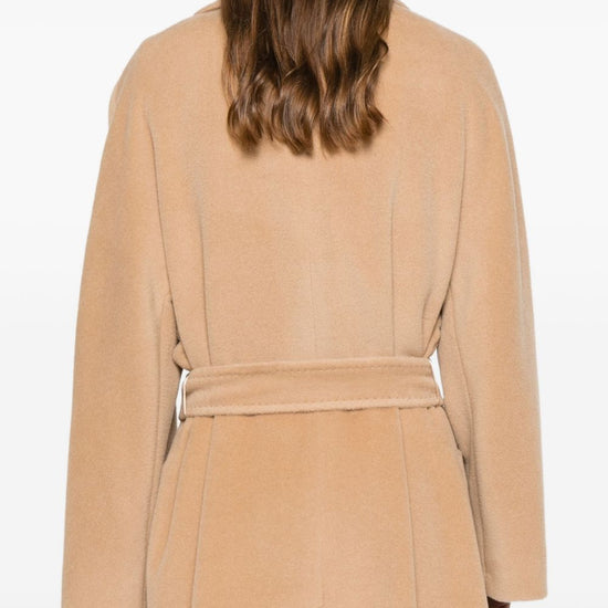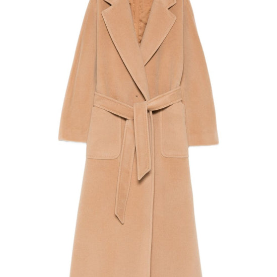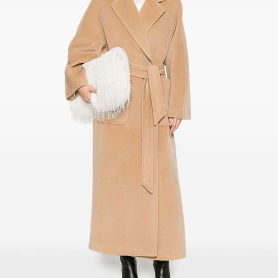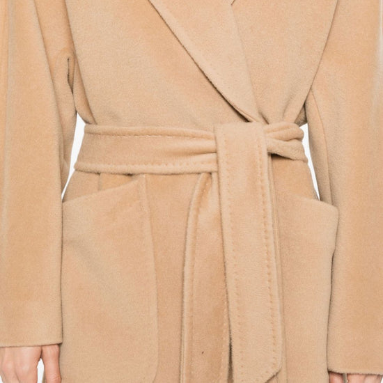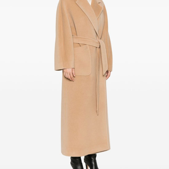 Beige notched lapel belt front patch pockets long sleeves wool long coat