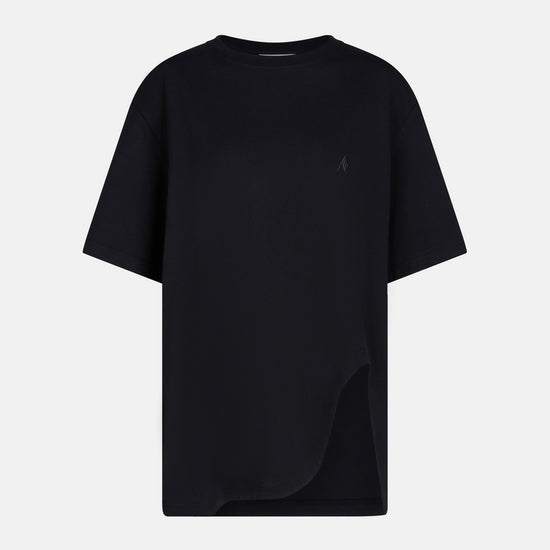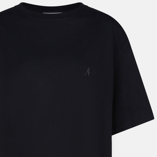 The attico black cotton t-shirt, featuring a ribbed crew neck, wide shoulders, tone-on-tone embroidered logo on the chest, shaped hem, and short sleeves. size and fit - model wears size 40 it model measurements: height: 178 cm chest: 83 cm waist: 63 cm hips: 91 cm