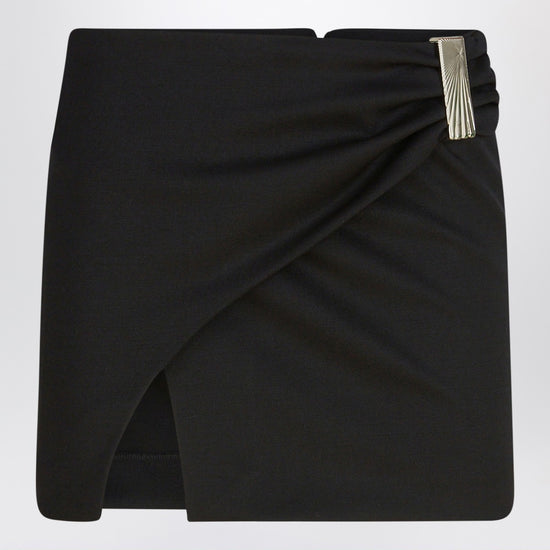 Mini skirt by the attico in black stretch wool gabardine, featuring rear zip closure, crossed front design with logoed metal clasp, and front slit. size and fit - model wears size 40 it model measurements: height: 178 cm chest: 83 cm waist: 63 cm hips: 91 cm