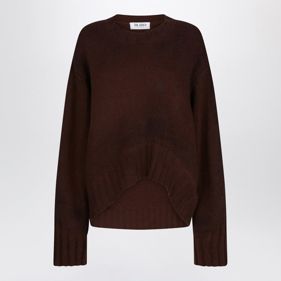 Crew neck sweater by the attico in brown wool and cashmere, featuring long sleeves, ribbed trims, tone-on-tone logo embroidery on the chest, and asymmetric hem shorter at the front. size and fit - model wears size 40 it model measurements: height: 178 cm chest: 83 cm waist: 63 cm hips: 91 cm