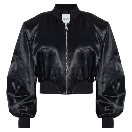 Black two welt pockets ribbed hem and cuffs zip fastening satin bomber jacket