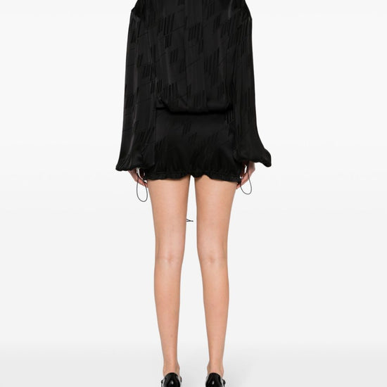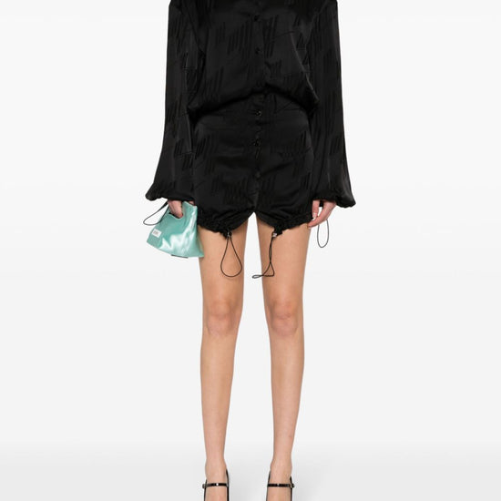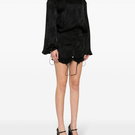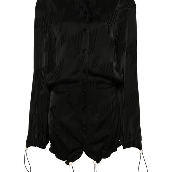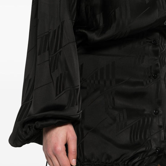 Black satin weave all-over jacquard-logo pattern logo-engraved buttons box-pleat detail to the rear straight-point collar drop shoulder long sleeves drawstring cuffs thigh-length front button fastening drawstring hem unlined jacquard logo disegno pied