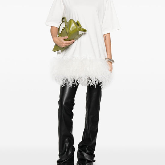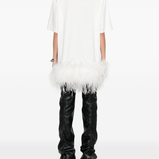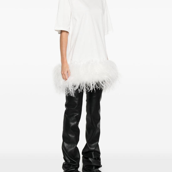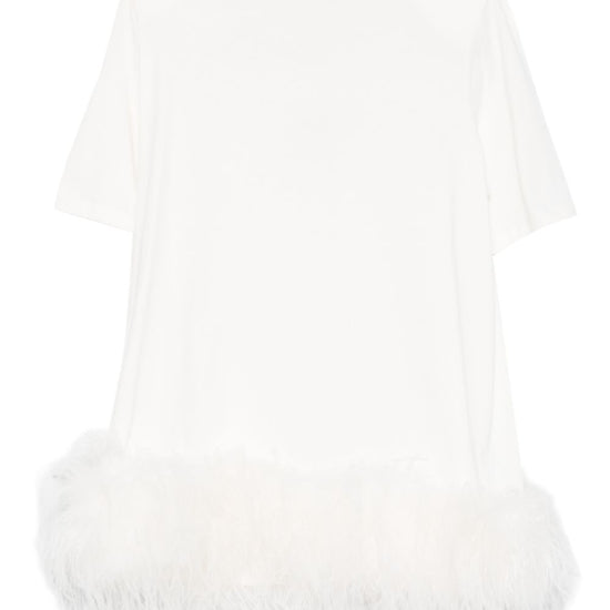 White cotton feather trim short sleeves round neck feathered short dress