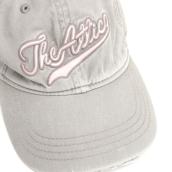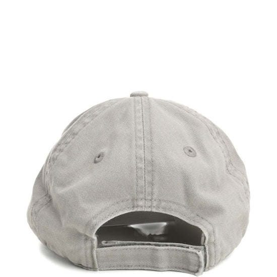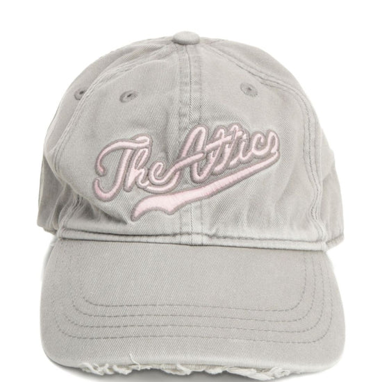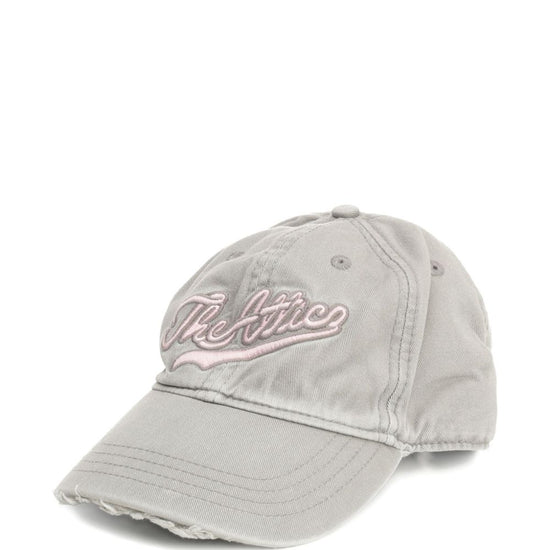 Grey, embroidered logo, frayed edge, curved brim, adjustable back strap. logo canvas baseball cap