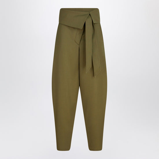 Wide-leg trousers by the attico in military green wool gabardine, featuring folded waistband with adjustable sash, two side welt pockets, and zipped ankle detail. size and fit - model wears size 40 it model measurements: height: 178 cm chest: 84 cm waist: 65 cm hips: 93 cm