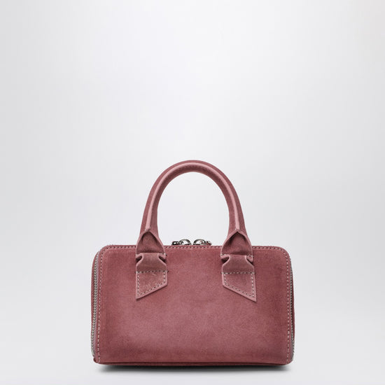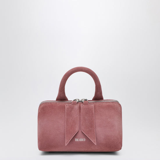 Mini bag by the attico in pink suede, featuring double-zip closure, top handle, adjustable and removable shoulder strap, contrasting front logo lettering, and silver-tone metal feet. size and fit - width 18 cm x height 12 cm x depth 10 cm handle drop 7 cm adjustable shoulder strap length min 57 cm - max 28 cm