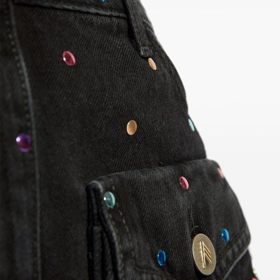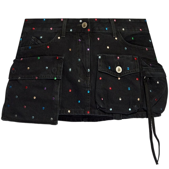 Jet black cotton rhinestone embellishment logo-engraved buttons belt loops concealed fly and button fastening classic five pockets two front flap pockets side zip-fastening pocket straight hem thigh-length fay denim mini skirt size and fit - this piece fits true to size. we recommend you get your regular size. model is 1,75m / 5ft 8in wearing size 27 (waist cm)