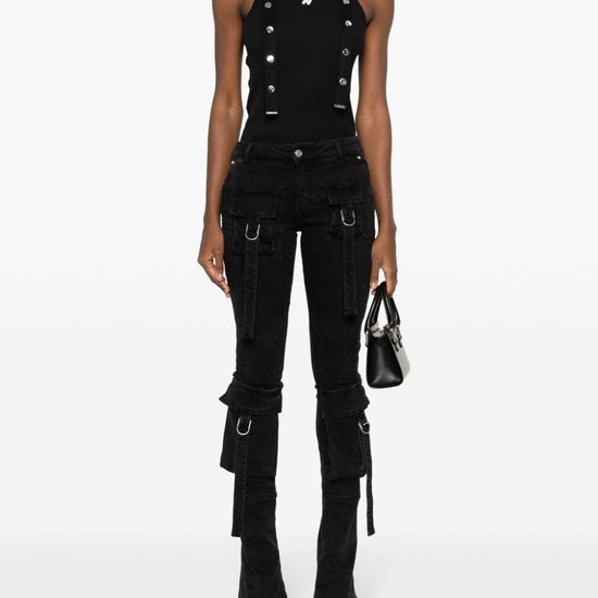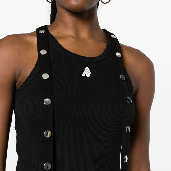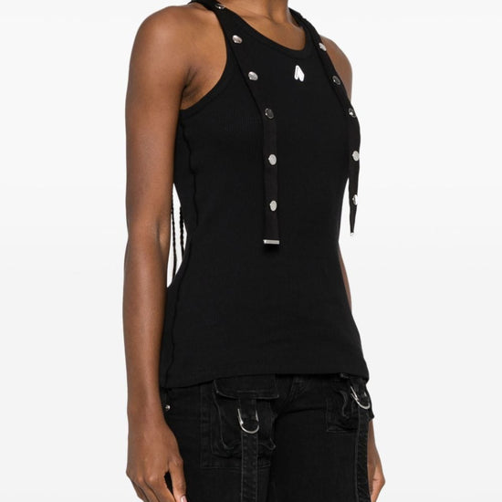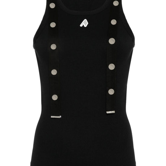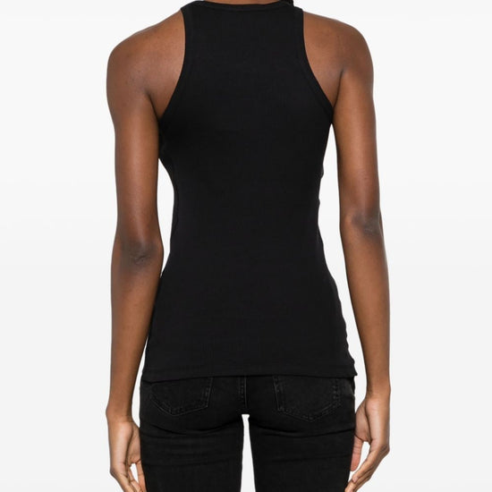Black cotton ribbed knit appliqué logo round neck adjustable shoulder straps sleeveless straight hem ribbed cotton tank top size and fit - this piece fits true to size. we recommend you get your regular size. model is 1,75m / 5ft 8in wearing size 40 (it)