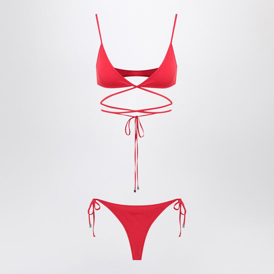 Two-piece bikini by the attico in red stretch fabric, featuring a bra with long ties to be knotted around the bust, contrasting logo on the back, and a giftable panty with side ties with metal tips. size and fit - model wears size s model measurements: height: 179 cm chest: 82 cm waist: 65 cm hips: 90 cm
