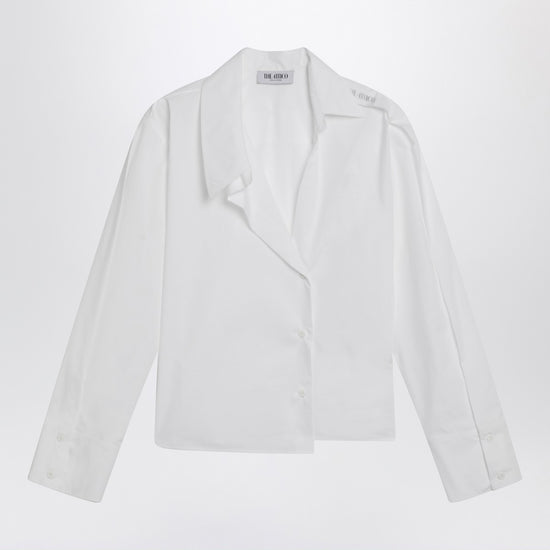 White cotton shirt by the attico, featuring asymmetric button closure, ruched waist design, v-neckline, and long sleeves with buttoned cuffs. size and fit - model wears size 40 it model measurements: height: 179 cm chest: 82 cm waist: 65 cm hips: 90 cm