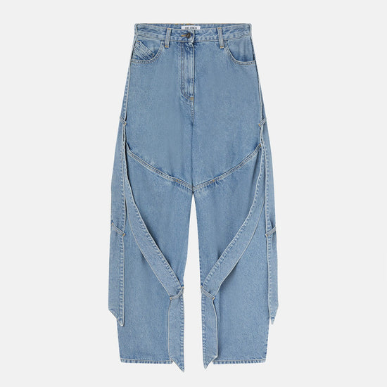 Wide jeans by the attico in light blue cotton denim, featuring a front zip and button closure, belt loops, five classic pockets, a back logo patch, and ribbon details. size and fit - model wears size 26 model measurements: height: 178 cm chest: 83 cm waist: 63 cm hips: 91 cm