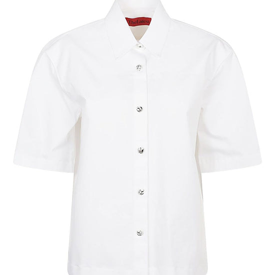 White shirt, short sleeves, jewel button closure, straight hem. ben cotton shirt size and fit - this piece fits true to size. we recommend you get your regular size. model is 1,75m / 5ft 8in wearing size s